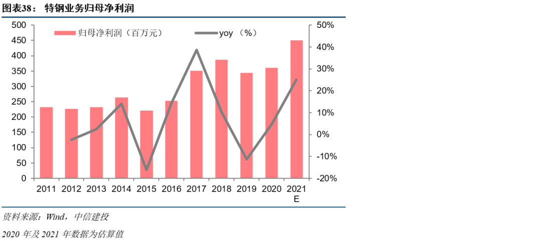 预计2021年-2023年,公司特钢新材料业务板块营收小幅增长,分别达到58.3/61.1/62.9亿元,增速则分别为24.9%/4.8%/3.0%。
