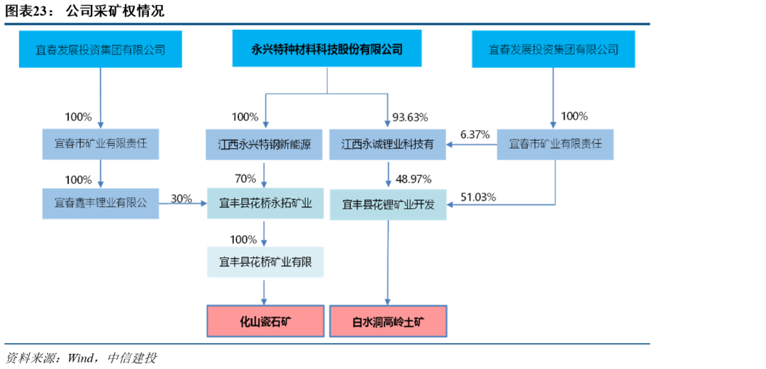 布局上游矿山资源,原料自给自足。资源是锂电产业发展的基石,在资源自给率不高的中国,上游的资源保障能力显得更为重要,不仅关系着生产成本的锁定,也决定着企业生产是否可以稳定可持续。永兴材料积极布局上游资源,旗下花桥矿业和花锂矿业分别拥有化山瓷石矿和白水洞高岭土矿,是公司锂云母和碳酸锂生产原材料的主要保障渠道。