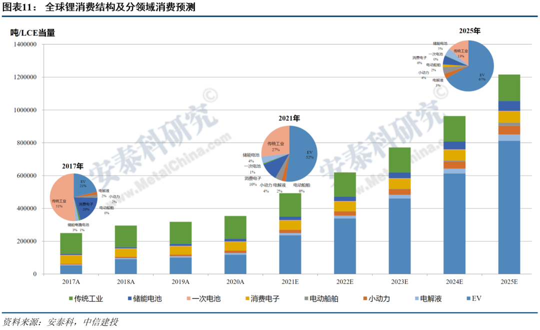 十四五期间,锂消费CAGR超30%。根据安泰科数据,2020年全球锂盐需求约33.6万吨LCE,预估2021年快速增加至53.5万吨LCE,2025年达到126.8万吨LCE。2020-2025年间的CAGR达到30.42%,锂市场将迎来新一轮需求周期。其中,最大消费增量来自新能源汽车,对锂的需求从2020年的不足15万吨LCE增加至2025年的超过80万吨LCE,新能源车占比提升至67%。