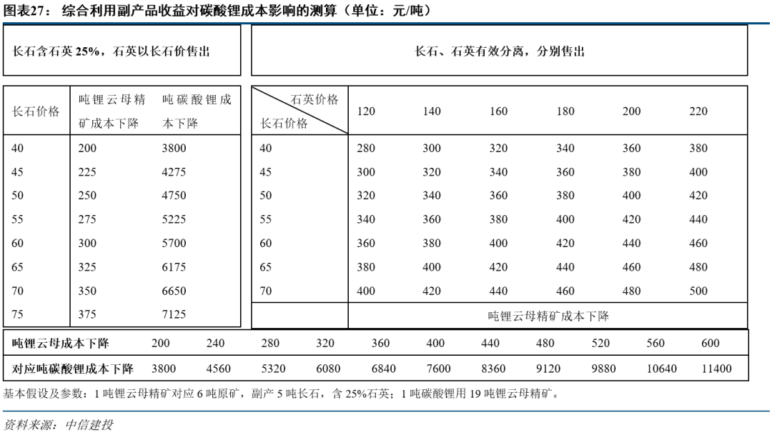 3、综合利用,打开降本空间。锂云母原矿含钽、铌、锂、铷、铯等多种稀有金属,在选矿阶段,选出锂云母精矿的同时,还可副产出钽铌锡精矿、长石等,对外销售所得可以部分覆盖锂云母的选矿支出,带来成本优势。公司副产品主要有三个来源:一是选矿副产钽铌锡,直接出售;二是选矿副产品长石,作为玻陶原料,宜春地区是中国第二大陶瓷基地,对长石需求量非常大;三是冶炼渣,一期项目产生的冶炼渣用于水泥添加剂以及制砖,不产生费用,也没有收益。目前产生效益的最主要的部分来自加长石。生产1吨锂云母精矿大约6吨原矿,根据原矿不同可同时副产数吨长石(按5吨估算)。永兴材料副产长石含约25%的石英,石英以长石价格售出,性价比偏低,假设售价在40-70元/吨,则可降低锂云母精矿成本200-350元/吨,对应碳酸锂成本下降3800-6700元/吨;若将石英分离分别出售,则可获得更高副产品收益,对降低碳酸锂综合成本效果较为明显。
