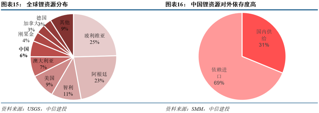 中国并不是一个锂资源丰富的国家。据美国地质调查局(USGS)数据,全球锂资源量约为8600万吨,玻利维亚、阿根廷、智利、美国等资源量位居前列,中国资源量约510万吨,占比6%;全球储量2100万吨,其中中国150万吨,占比7%。相比锂资源丰富的南美锂三角国家、澳大利亚等,中国并不是一个锂资源丰富的国家,且国内资源禀赋较差,品位低、共生元素多、杂,优质资源不多。