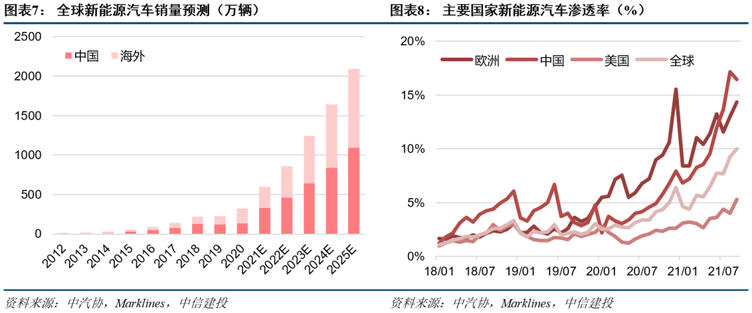 处于S曲线高速增长的陡峭区间起点,未来渗透率加速。产业经济学视角下,渗透率的提升有经典的非线性特征,呈现出类似于种族增长S型曲线的特征:渗透率在10%以下时,产业处于“导入期”,属于发展前期;渗透率到达10-15%的临界点后,将进入高速增长期,又称S型增长曲线的陡峭阶段,强劲而陡峭地攀升至S型曲线的顶部,达到饱和状态,此时的市场占有率往往会达到90%。中国新能源汽车渗透率在2020年仅为5.4%,今年已经接近13%,2021年11月单月更是达到17.8%,中国新能源汽车产业的增长完全符合S型的增长曲线,目前正处于S型曲线快速上升的拐点位置,未来渗透率将进一步加快。