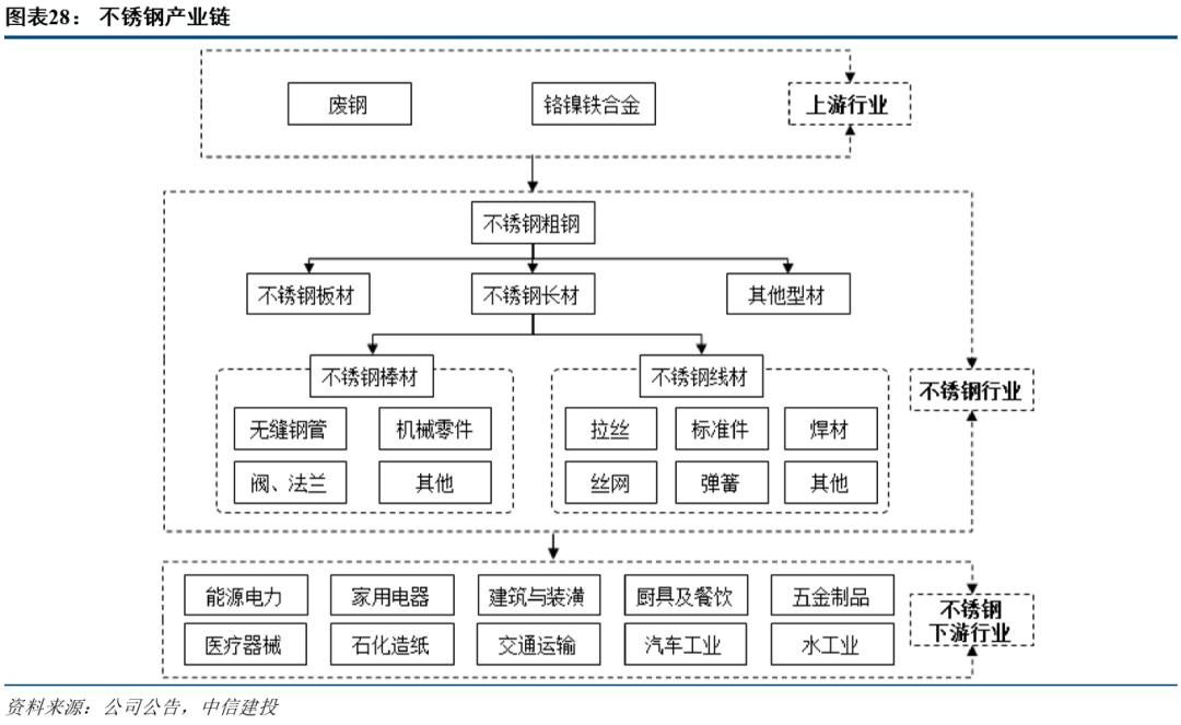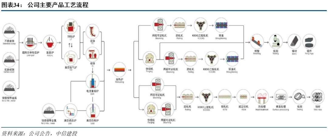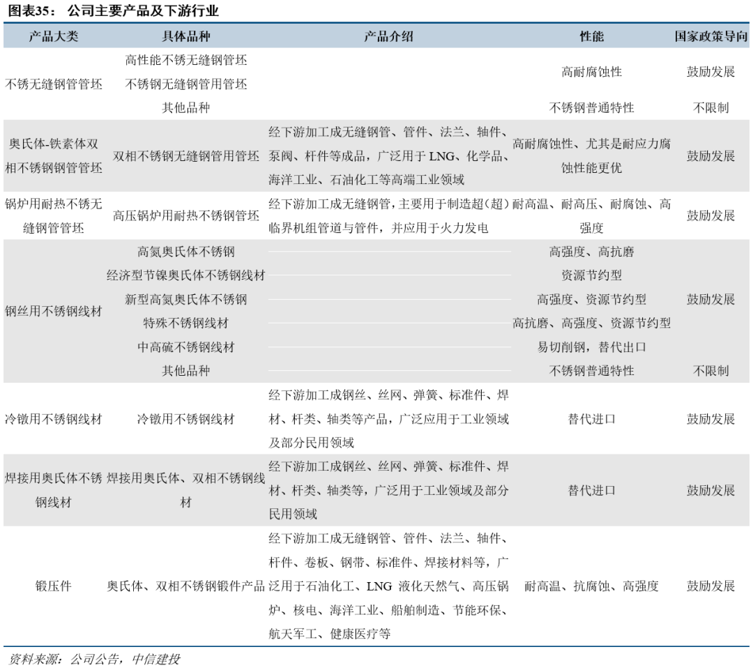 产品种类丰富,规格品种齐全。公司的主要产品为不锈钢棒材和不锈钢线材,公司重点生产“专、精、特、新”产品,经过多年不断研发创新,公司目前已拥有十一大类200多个品种。公司不锈钢棒材有三大类,包括高压锅炉用不锈钢棒材、双相不锈钢棒材以及奥氏体不锈钢棒材,主要被加工成无缝钢管应用于火力发电、LNG液化天然气、化学品、海洋工业、精细化工、核电、医药食品、船舶制造等高端工业领域。不锈钢线材有四大类产品,包括切削用不锈钢线材、焊接用不锈钢线材、冷镦用不锈钢线材、拉丝用不锈钢线材,主要被加工成钢丝、丝网、弹簧、标准件、焊材、杆类、轴类等产品。此外,公司还为客户提供个性化、小批量定制服务,从而进一步拓宽下游市场空间。