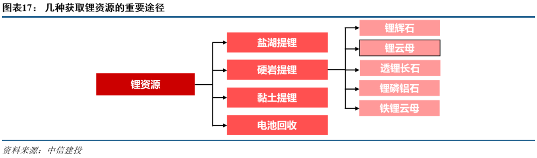锂云母是最常见矿物之一,是提锂的重要矿物。锂资源类型分为一次资源、二次回收资源等,一次资源中,目前最主要的卤水提锂和硬岩提锂两大类,其中硬岩型锂矿包括锂辉石、锂云母、透锂长石等。从资源量分布来看,全球卤水型锂资源占比约60%,集中在南美洲的玻利维亚、智利、阿根廷;硬岩型锂矿资源约占全球已探明锂资源的30%,锂辉石主要在澳大利亚、美国、中国,其中澳大利亚拥有世界上最大的硬岩型锂矿出口国,锂云母矿主要分布于津巴布韦、加拿大、美国、墨西哥和中国。从当前锂资源供应结构来看,供应以西澳锂精矿和南美锂盐湖为主,锂云母资源多在津巴布韦、加拿大、美国、墨西哥、中国等国,开发以中国江西为主。