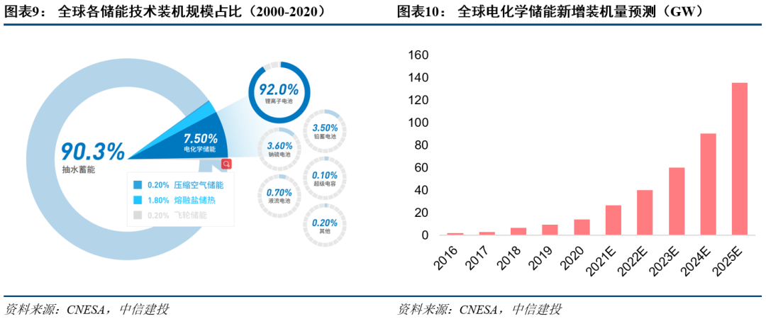 双碳背景下,电力结构转型催生储能需求。新一轮能源变革时代,电力是能源转型的中心环节,也是未来减碳的关键领域,风电光电等非石化能源发电量的比例将持续上升。由于风电、光伏具有天然不稳定性、间歇性的问题,必须搭配储能才可消解波动性,实现电网的稳定运行,因此在大力发展风电、光伏的同时配套储能设施是电网企业的必需选择之一。储能技术包括机械储能(抽水、压缩空气等)、电磁储能(超导、超级电容等)、电化学储能(电池)、化学储能(制氢)等,据CNESA数据,全球储能装机规模最大的为抽水蓄能,占比达到90.3%;电化学储能技术日渐成熟,成本持续下降,占储能装机规模总量的7.5%,其中的92.0%为锂电池;另据GGII统计,2020年储能锂电池中,磷酸铁锂电池占储能锂电池的90%以上。