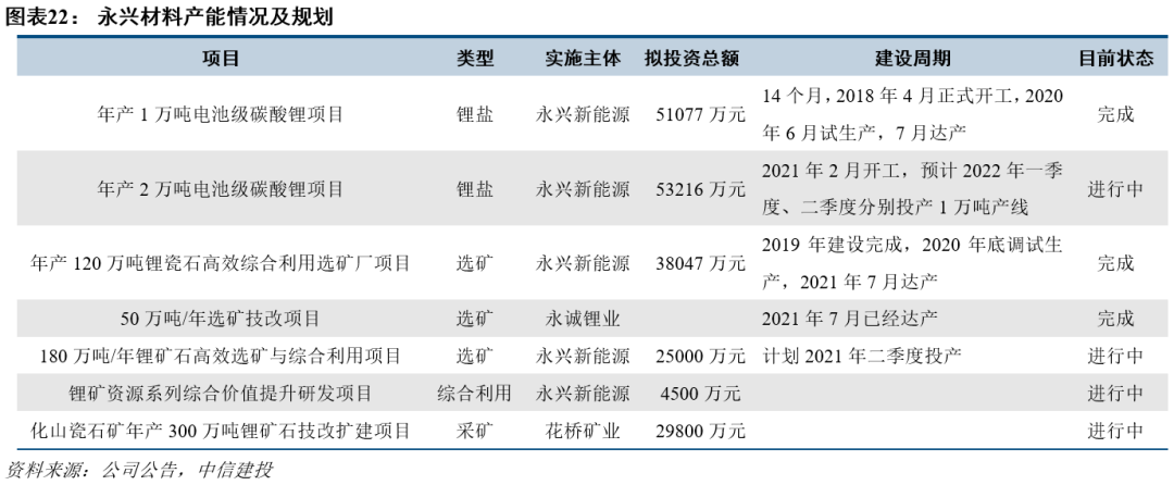 采选冶配套,未来产能翻倍扩张。公司目前配套采矿能力100万吨,配套选矿产能170万吨/年(永兴新能源120万吨+永城锂业50万吨),目前都已经完全满产,满足公司一期1万吨/年碳酸锂对原料需求。公司二期扩建工程正在进行,其中包括采矿扩建:180万吨/年锂矿石高效选矿与综合利用项目已完成立项、可研报告编制等工作,环评已公示,二期达产后,采矿总产能达到300万吨/年;选矿扩建:配套新建选矿产能180万吨/年,达产后实现合计350万吨/年选矿产能,公司采选基本匹配,较一期产能实现翻倍扩张。采选扩建工程配套二期2万吨碳酸锂产能,全部达产后,足以支撑3万吨电池级碳酸锂的原料需求。