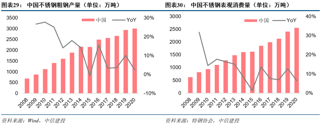 消费升级、新应用领域拓展,中国不锈钢消费持续增长。据特钢协会统计的数据,2008年以来,我国不锈钢的表观消费量从2008年624万吨,到2020年已经达到2560.79万吨,年复合增长率高达12.5%。未来,中国制造业转型升级,不锈钢的下游传统重要应用领域(如日用制品、建筑、工程机械、家电电子及汽车等领域)内,不锈钢的消费量将继续维持增长,并且产品结构将不断改善,中高端产品的占比有望不断提升。在新领域消费多点开花:工业领域消费——如城市轨道、交通车辆、石油天然气加工运输及城乡基础建设工程,高端制造业——超临界和超(超)临界发电设备、环境恶劣的采油设施、LNG船的建造等;新兴领域——海洋开发、航空航天(军工)、新能源开发(核电)、节能环保等,都是不锈钢新的应用热点。