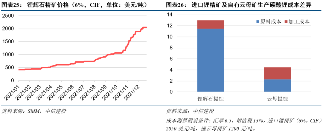 江西省、宜春市政府持续汇集各方面政策推进锂电新能源产业发展,2017年宜春政府出台了《加快推进锂电新能源产业发展的决定》,后相继印发《宜春市锂电新能源产业发展优惠政策》《宜春市锂电新能源产业发展扶持政策兑现操作细则》《关于加快推进锂电新能源产业发展的实施意见》等鼓励政策文件,打造国家锂电高新技术产业基地,重点打造碳酸锂、锂电池材料、动力及储能锂电池和新能源车四大生产基地。其中明确提出,支持提升锂云母选矿技术,加强对钽铌矿、旭锂矿业等选矿企业的技术指导,逐步规划配套建立相应的锂云母选矿企业;对落户宜春国家锂电新能源高新技术产业化基地的碳酸锂和锂电池主要材料生产企业,优先供应锂云母和电池级碳酸锂,最大限度把当地锂云母资源优势转化为产业优势。技术、政策双重支持下,江西地区锂云母提锂产能已初具规模,在碳酸锂高价刺激下,产量具备加速释放的动力。