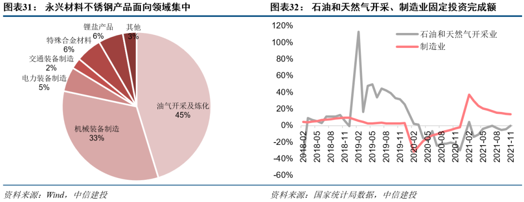 永兴材料不锈钢产品主要面向油气开采与炼化、电气、机械装备制造领域,占据了公司近80%的营收份额,下游景气度关乎公司产品需求及市场景气程度。2020年由于新冠疫情,石油需求大大降低。但随着疫情的减缓和供给端有效减产,油价进入上升通道。当下油价已经回到2019年水平,“三桶油”的2021的资本支出计划也大幅度回升,根据国家统计局数据,2021年以来,我国石油和天然气开采固定资产投资完成额、制造业固定资产投资回暖明显。