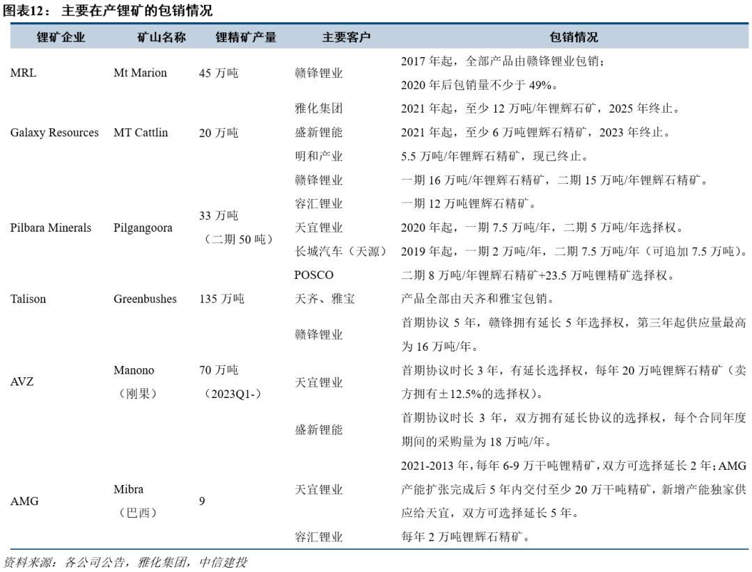 矿山产销以包销模式为主,供应紧张时更易加速价格上涨。澳洲主力矿山以长单包销为主,一些新建、扩建产能也已敲定包销协议,这些合计占了海外锂矿产量的85%以上,包销权主要集中在几家大的锂盐加工企业手中如赣锋、天齐等,而对于大部分中小规模锂盐加工企业而言,没有资源的保障,只能在市场上收购仅有的少量流通散单,在市场供应紧张的时候,会导致锂盐企业现货市场抢货行为,加剧市场供应紧张程度,出现以小撬大式的价格滚动走高,推动价格更快上涨。