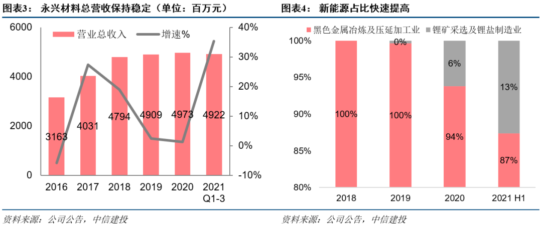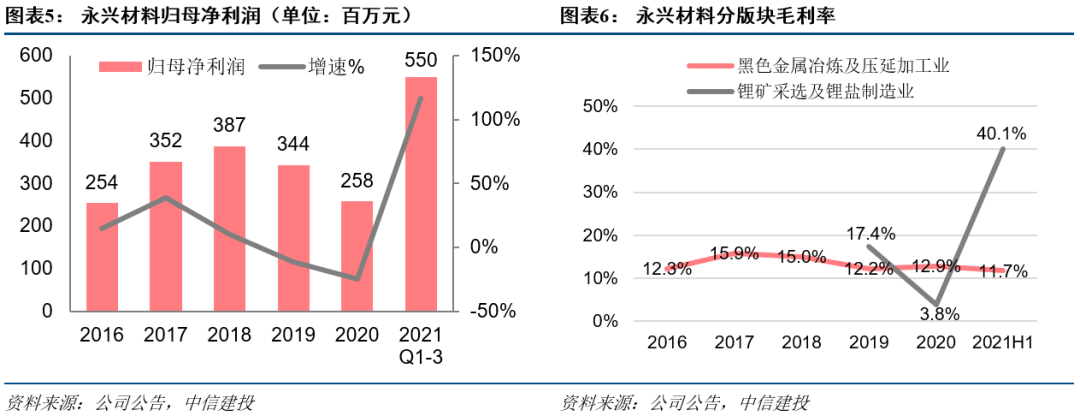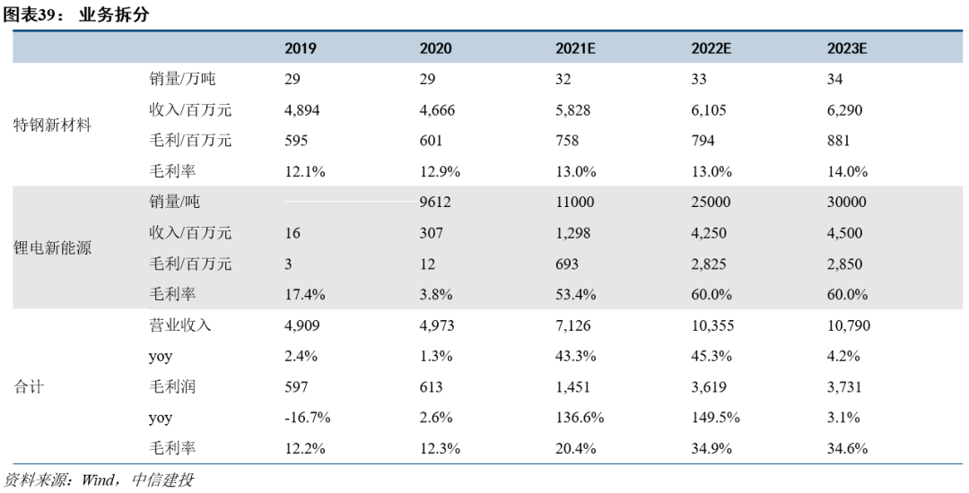 营收:特钢新材料业务稳中向好,新能源业务成为增长极。特钢新材料业务是公司传统主业,营收近年来保持稳定,近三年稳定在47亿元附近;2021年1-9月,公司特钢新材料业务实现产品销量23.31万吨,实现归属于上市公司股东净利润3.32亿元,其中三季度特钢业务经营稳健,实现产品销量8.12万吨,实现归属于上市公司股东净利润1.38亿元(含转让上海新太永康健康科技有限公司股权处置收益)。同时,锂电新能源业务产能释放、量价齐升,带动公司业务增长;2021年1-9月,锂电新能源业务实现碳酸锂销量8158.4吨,实现归属于上市公司股东净利润2.18亿元,其中三季度实现碳酸锂销量2635.4吨,实现归属于上市公司股东净利润1.10亿元,合计实现归属于上市公司股东净利润2.48亿元,同比增加172.97%。2021年前三季度合计实现归属于上市公司股东净利润5.50亿元,同比增加116.61%。