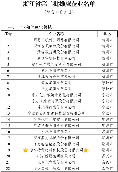 日前,省制造业高质量发展领导小组办公室公布了浙江省第二批雄鹰企业名单,新区企业永兴特种材料科技股份有限公司榜上有名,成为新区首家雄鹰企业。