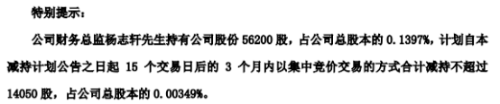 公告显示,财务总监杨志轩持有公司股份56200股,占公司总股本的0.1397%。本次拟减持的原因系个人资金需求,股份来源为股东通过二级市场增持的股份。