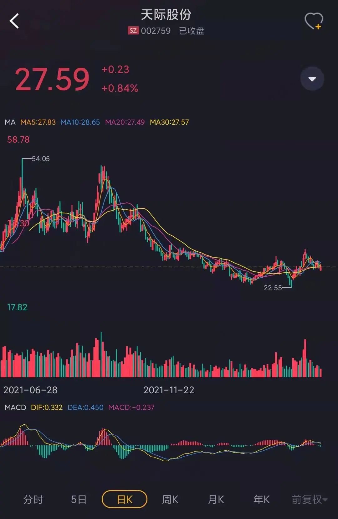 截至2022年4月1日收盘,天际股份报收27.59元/股,总市值111亿元。
