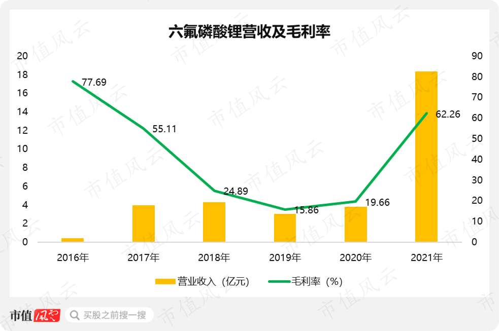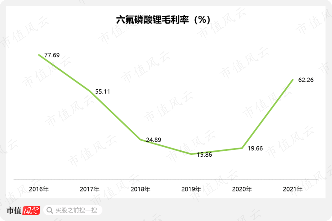 并且,市场价格的攀升也直接带动了六氟磷酸锂产品毛利率的改善。其毛利率从底部的不足20%,直接拉升至62.26%。