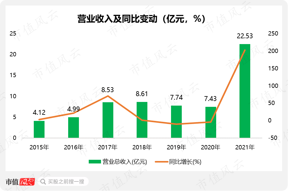 天际股份2015年上市,2017年,其收入有一个比较明显的增长,但高潮过后便一蹶不振,直到2021年迎来爆发。