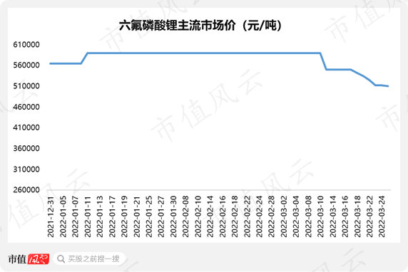 截至2022年3月25日,六氟磷酸锂的市场主流价为51万元/吨。