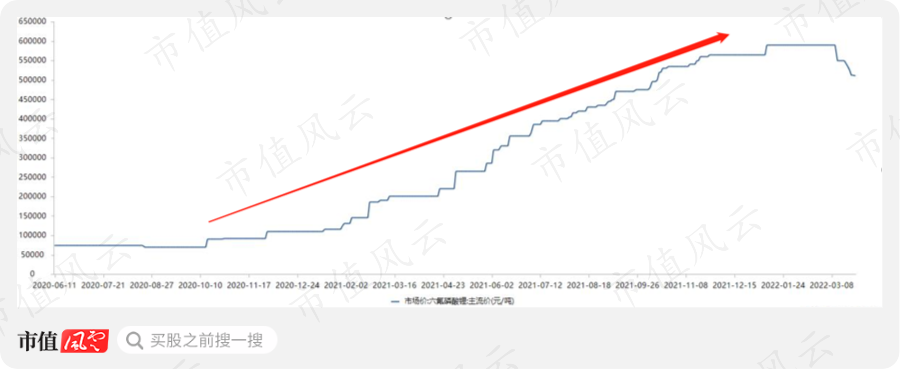进入3月份以来,六氟磷酸的市场主流价已开始出现一定幅度的下降,虽然目前仍处高位,但已经由高点的59万元/吨降至51万元/吨(截至2022年3月25日),降幅约14%。