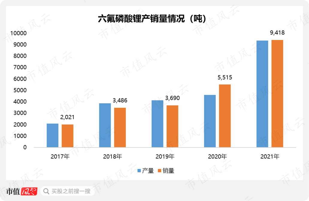 目前,天际股份六氟磷酸锂的产能为8160吨,2021年的产量为9364吨,销量为9418吨,同比增长71%,可见其下游需求的旺盛。