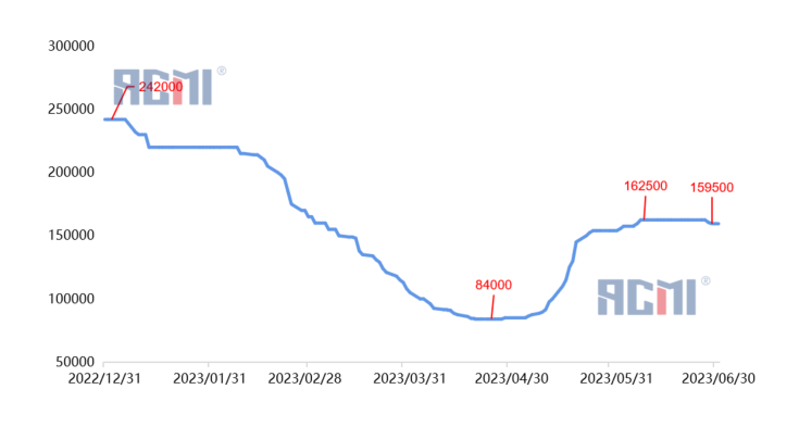 2023年上半年六氟磷酸锂市场价格走势图,数据来源:CBC金属网锂电价格数据库,ACMI制图
