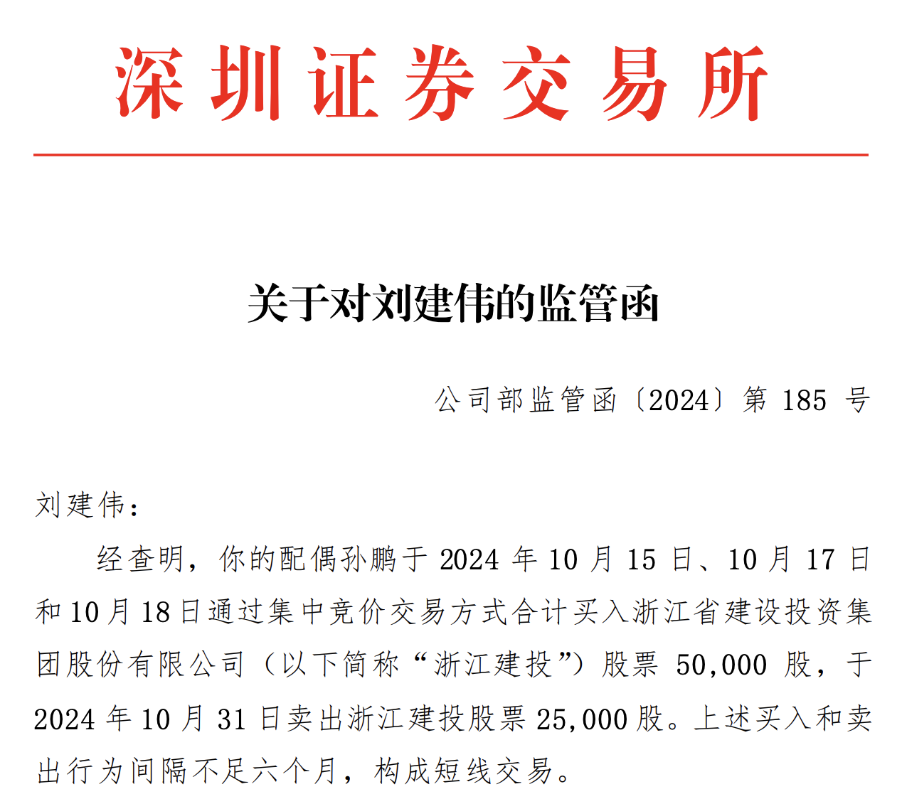 经查明,刘建伟的配偶孙鹏于2024年10月15日、10月17日和10月18日通过集中竞价交易方式合计买入浙江建投(002761.SZ)股票50,000股,于2024年10月31日卖出浙江建投股票25,000股。