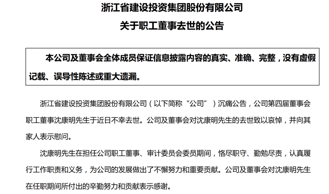 7月3日,浙江建投公告:职工董事沈康明先生于近日不幸去世。知情人士称,沈康明系坠楼身亡,享年只有54岁。