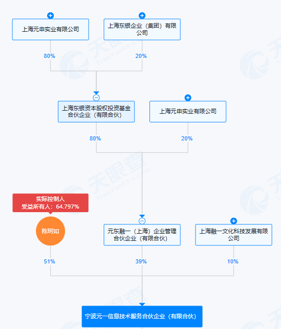 从元一成物提供的股权结构图来看,宁波元一信息技术服务合伙企业(有限合伙)(以下简称:宁波元一)是元一化物的控股股东。陈珂如持有宁波元一51%份额,未见图示其他主体对宁波元一的持股。