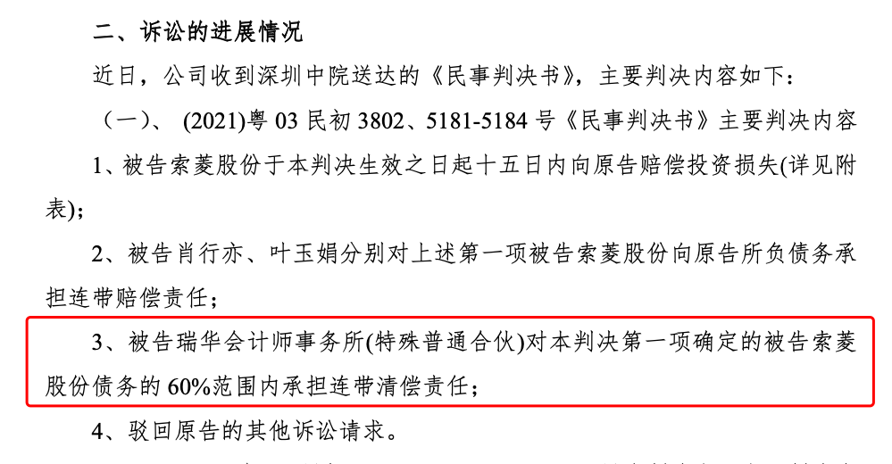 在部分判决中,索菱股份财报的审计机构瑞华会计师事务所(特殊普通合伙)也被判决承担连带清偿责任。