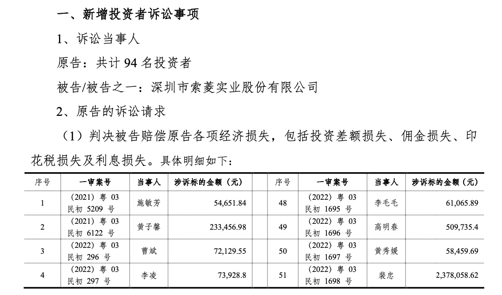 公告显示,新增94名投资者起诉索菱股份,要求赔偿投资差额损失、佣金损失、印花税及利息损失合计约1790万元。