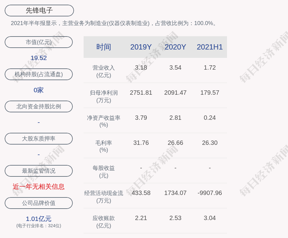 2021年半年报显示,先锋电子的主营业务为制造业(仪器仪表制造业),占营收比例为:100.0%。