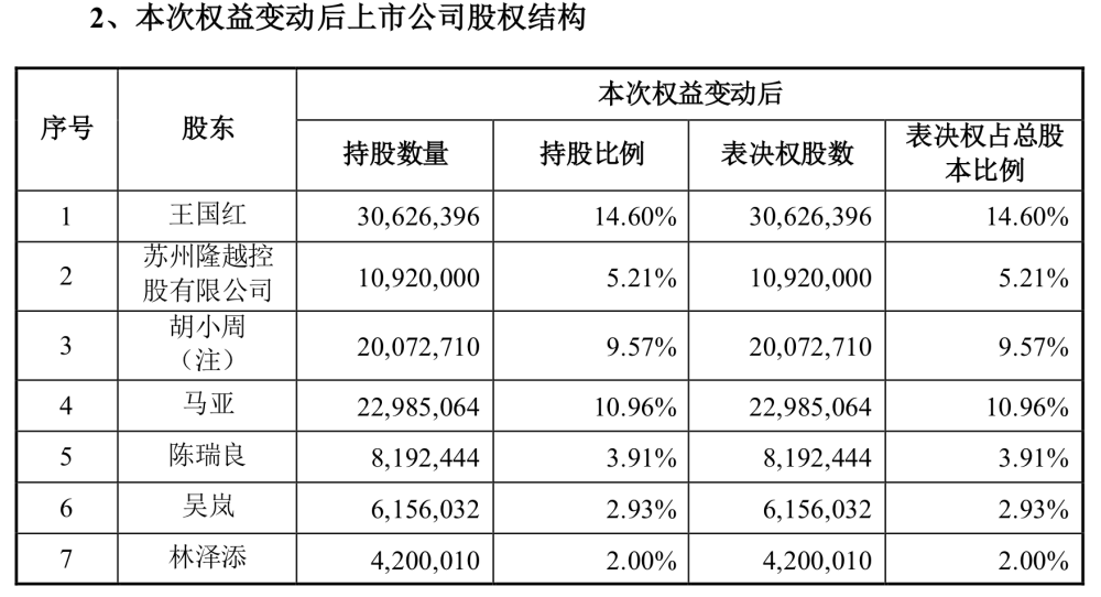 其次,王国红与苏州隆越签署《表决权委托协议之解除协议》,约定自协议生效之日起王国红不再受到2019年8月30日签署的《表决权委托协议》任何条款的约束与限制,王国红持有的上市公司3062.64万股所有股东权利均将由王国红完全自行行使。《表决权委托协议之解除协议》自上述1380万股股份过户至马亚名下起生效。解除表决权委托后,王国红持有的上市公司表决权比例增加至14.6%。