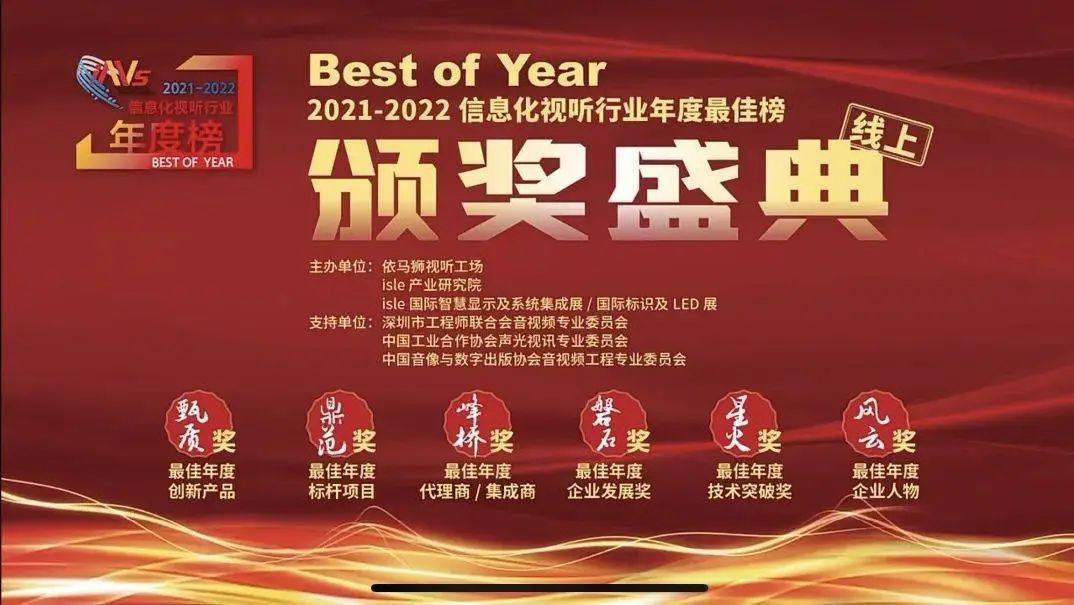 近日,“Best of Year 2021-2022信息化视听行业年度最佳榜单”颁奖盛典在线上隆重举行。本届颁奖盛典由依马狮视听工厂、isle产业研究院、isle展联合主办,以及多家行业委员会联合支持。本年度最佳榜单,以褒扬先进、助力企业和行业发展为宗旨,携手专家、同仁聚集行业智慧,深研行业发展现状,擎见发展新格局,共同探索行业新未来。