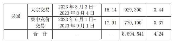 吴岚于2023年8月3日至2023年8月4日,减持股数929,300股,减持均价15.14元,减持方式为大宗交易;于2023年6月1日至2023年9月1日,减持股数770,100股,减持均价17.91元,减持方式为集中竞价交易。经计算,吴岚减持金额约为2786.21万元。