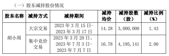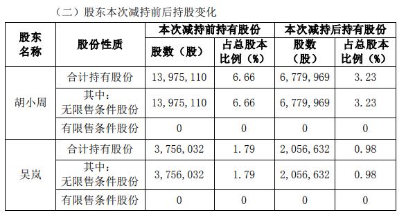 胡小周和吴岚合计减持股数8,894,541股,合计减持比例4.24%。