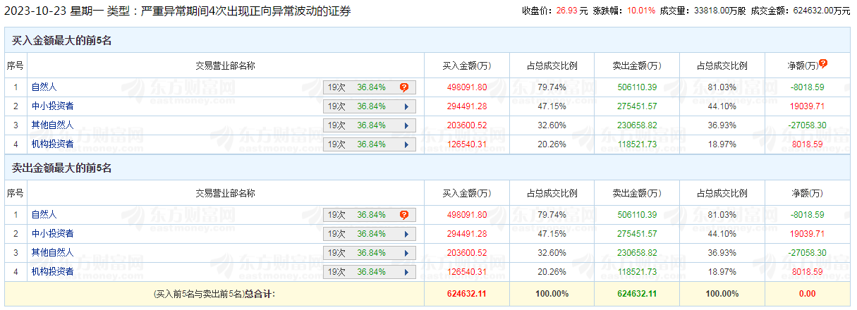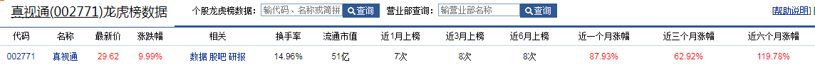 10月23日龙虎榜数据显示,真视通因属于连续三个交易日内收盘价格涨幅偏离值累计20%、严重异常期间4次出现正向异常波动的证券而登上龙虎榜。真视通当日报收26.93元,涨跌幅为10.01%,换手率9.47%,振幅6.94%,成交额62.46亿元。