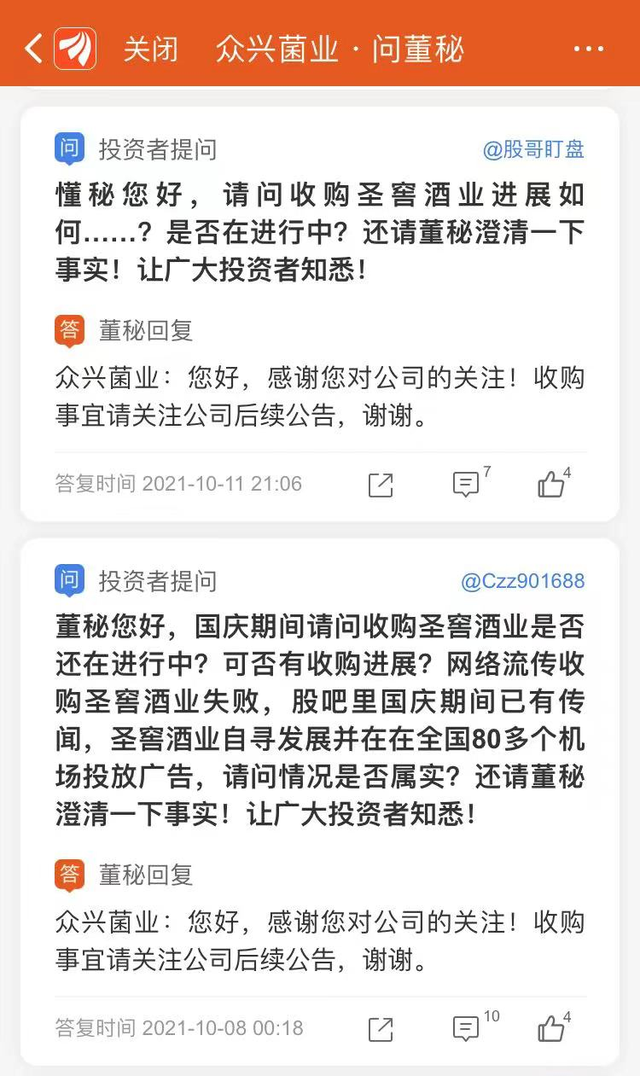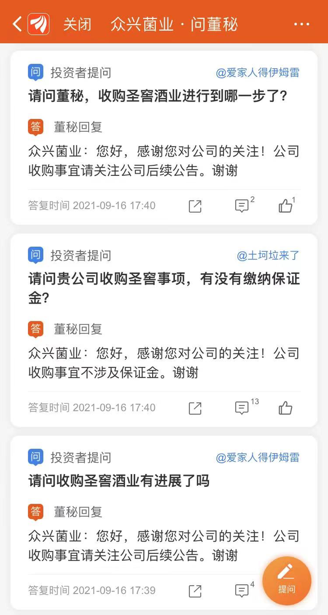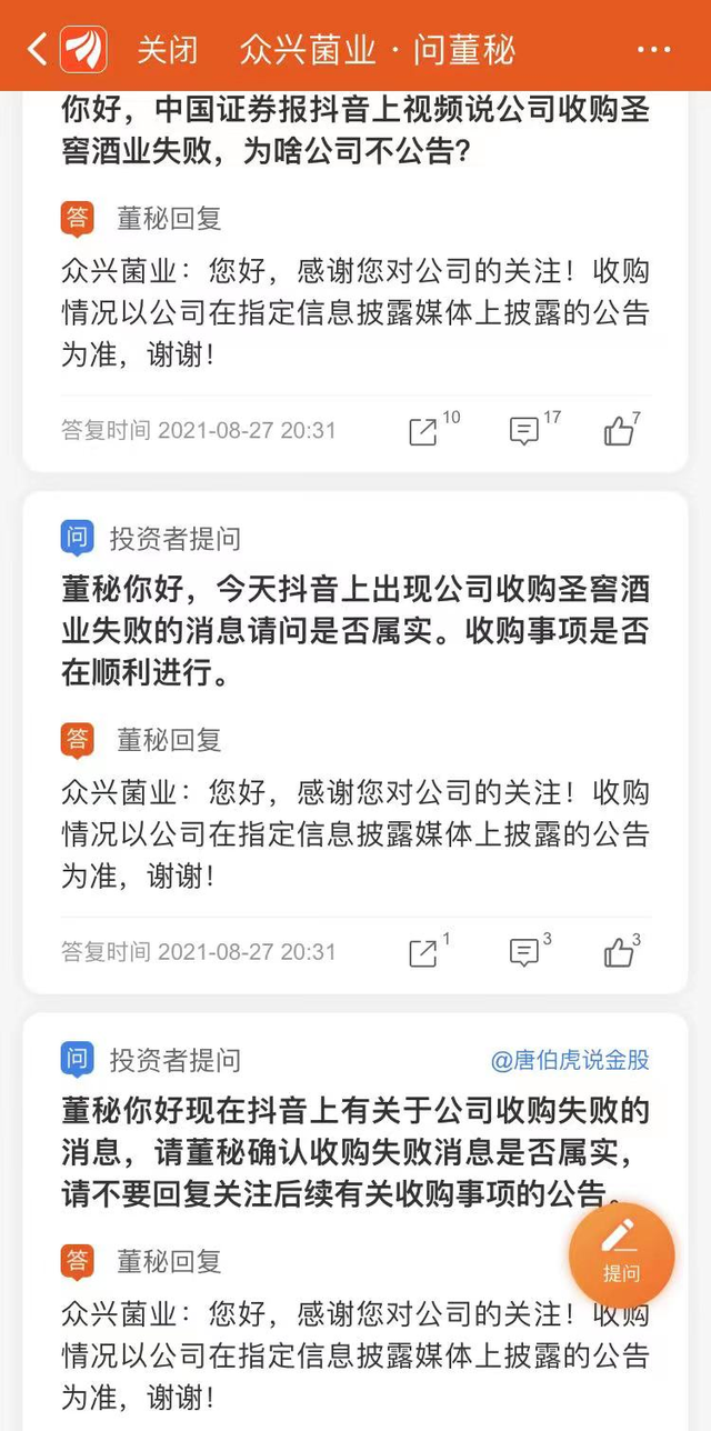 懂酒谛注意到,众兴菌业收购失败的消息似乎早有端倪,在8月25日终止收购的2天后,27日,便有投资者在投资平台上向众兴菌业提问,“董秘你好,现在抖音上有关于公司收购失败的消息,请董秘确认收购失败消息是否属实?”此后,也不断有投资者向众兴菌业询问,公司收购圣窖酒业是否已经失败?