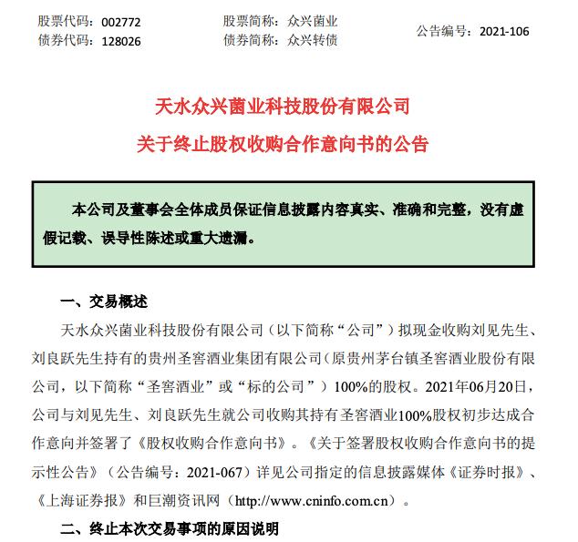 10月15日晚间,众兴菌业发布公告称,因市场宏观环境发生变化等原因,公司终止收购贵州圣窖酒业集团有限公司(以下简称“圣窖酒业”)100%股权。