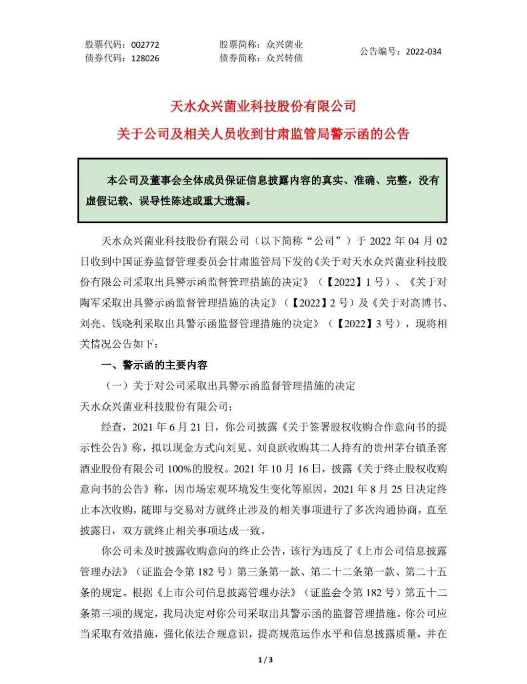 4月6日,众兴菌业(002772)公告称,因未及时披露收购意向的终止公告,甘肃证监局决定对公司采取出具警示函的监督管理措施,公司实控人陶军、董事长高博书、总经理刘亮及董事会秘书钱晓利一并被罚。