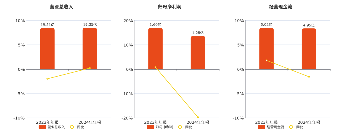 公司营业总收入为19.35亿元。归母净利润为1.28亿元,较去年同报告期归母净利润减少3155.19万元,同比较去年同期下降19.77%。经营活动现金净流入为4.95亿元,较去年同报告期经营活动现金净流入减少796.11万元,同比较去年同期下降1.58%。