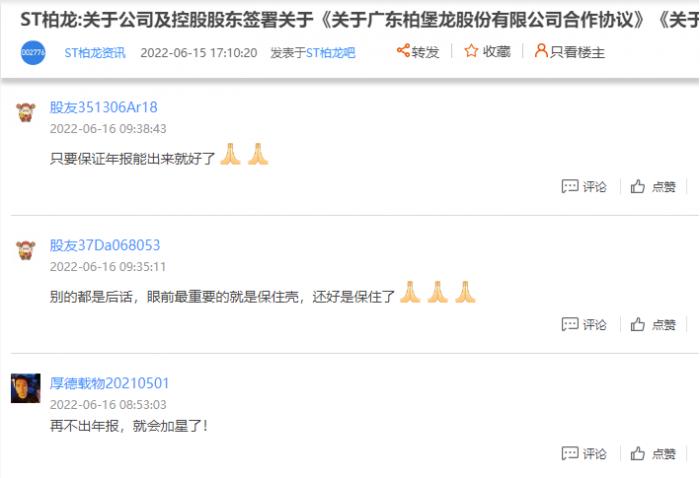在ST柏龙的股吧里,股民们都希望ST柏龙的2021年年报能尽快出来,保住上市公司的壳资源。