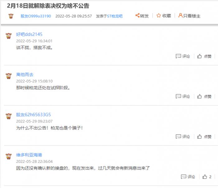 此消息一出,ST柏龙的股吧里顿时“炸锅”,还没有开始的合作就“胎死腹中”了,有股民直接质疑,“2月18日就解除表决权为啥不公告?”