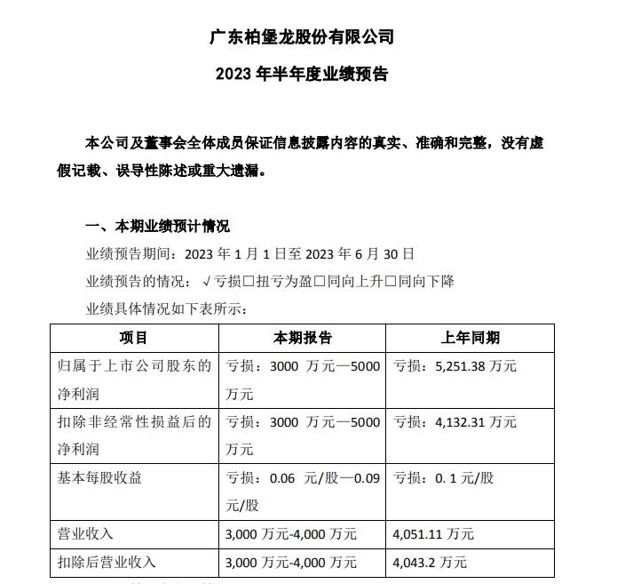 中新经纬7月18日电*ST柏龙17日晚间发布半年度业绩预告,预计2023年上半年亏损3000万元-5000万元。