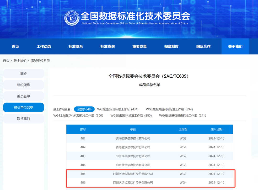 近日,全国数据标准化技术委员会(简称全国数标委)成员单位名单公示,久远银海成功入选WG3数据流通利用标准工作组和WG4全域数字化转型标准工作组,标志着公司在数据要素领域的专业能力得到了国家权威机构认可。