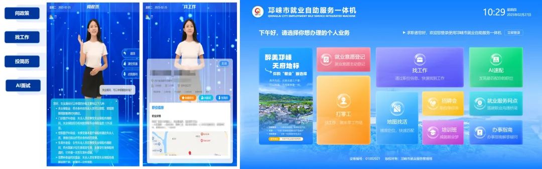 构建数字乡村人才服务站,打造数字化公共服务空间。研发数字人一体机、自助服务一体机、远程面试一体机,将人才服务延伸到家门口。基于大模型能力底座,打造智能化服务场景,为“三农”人才提供智能问政、AI客服、AI速配、地图找活、远程面试等一站式就业服务。其中,数字人一体机可快速识别普通话、邛崃话,结合言语、手势等多模态数据,高效响应咨询需求,实现智能交互新体验。