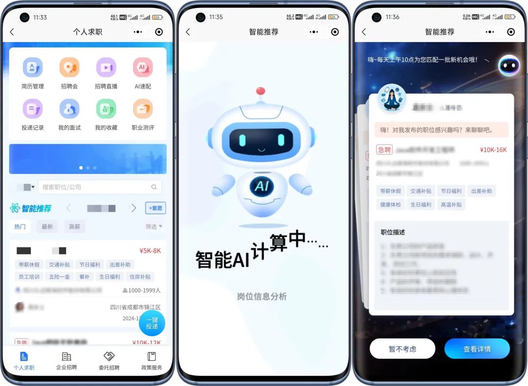 建设职易聘小程序,打造在线人力资源精准供需、零工市场、三级劳务服务等掌上服务场景,实现简历智能生成、人岗智能匹配、智能职业测评、掌上零工市场、工单智能调度等便民服务,以技术赋能打破城乡资源壁垒,切实解决就业信息不对称、岗位匹配效率低、零工市场管理不规范等问题,全面提升就业服务的精准性、便捷性和高效性,优化人才服务体验。