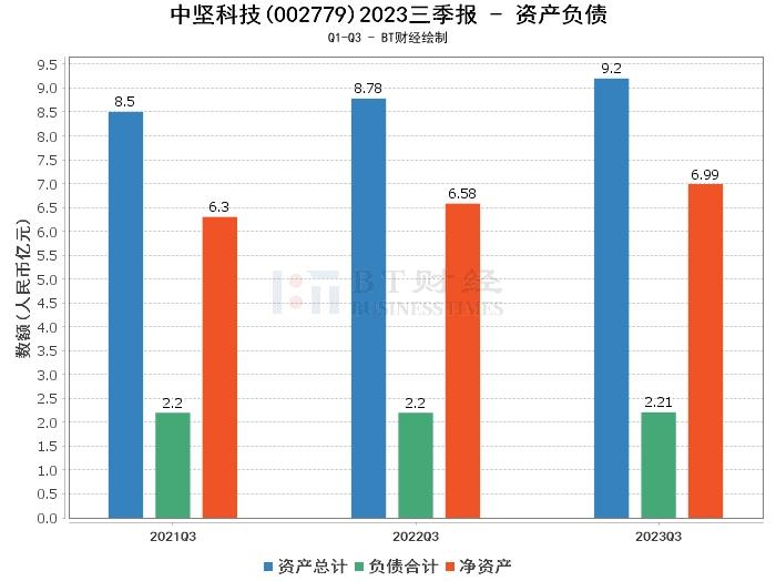 从2023年三季报的数据来看,中坚科技的总资产从上年度末的8.9亿元增长到本报告期末的9.2亿元,增长了3.37%。负债合计从上年度末的2.35亿元降低到本报告期末的2.21亿元,降低了5.96%。净资产从上年度末的6.55亿元增长到本报告期末的6.99亿元,增长了6.69%。资产负债率从上年度末的26.42%降低到本报告期末的24.05%,降低了2.37个百分点。这些数据显示,公司的资产状况良好,负债水平得到了控制。