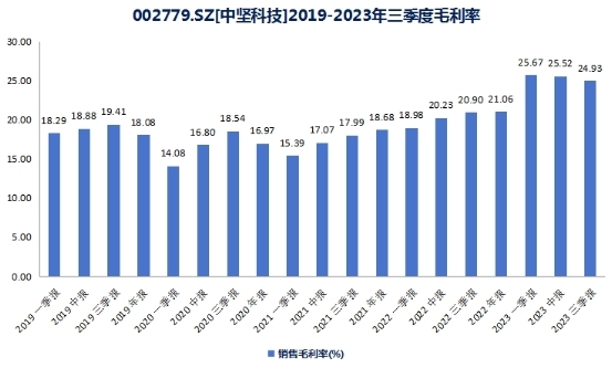 毛利率方面,今年前三季度,中坚科技毛利率来到25%一线,创公司上市以来的最好水平。