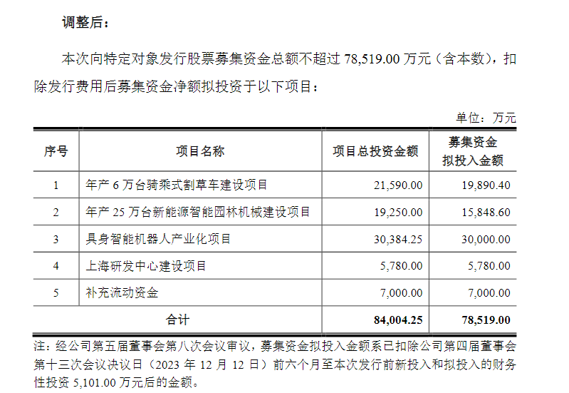 12月12日,中坚科技披露调整公司2023年度向特定对象发行股票方案的公告,对本次定增预案中募集资金用途进行调整。具体来看,中坚科技将募集资金总额调整至不超过7.852亿元,同时,在募投项目中增加了“具身智能机器人产业化项目”。