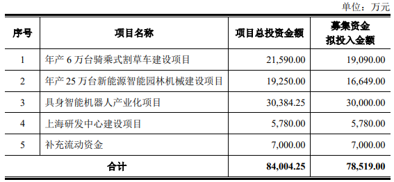 中坚科技2024年12月12日披露的2023年度向特定对象发行股票预案(二次修订稿)显示,本次向特定对象发行股票募集资金总额不超过78,519.00万元(含本数),扣除发行费用后的募集资金净额将用于以下项目:年产6万台骑乘式割草车建设项目、年产25万台新能源智能园林机械建设项目、具身智能机器人产业化项目、上海研发中心建设项目和补充流动资金。