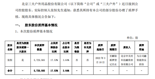 2022年3月22日,三夫户外还公告称,近日接到公司控股股东、实际控制人张恒通知,获悉其所持有本公司的部分股份办理了质押手续,质押股份数量达572.96万股,占其所持有股份比例达17.53%。